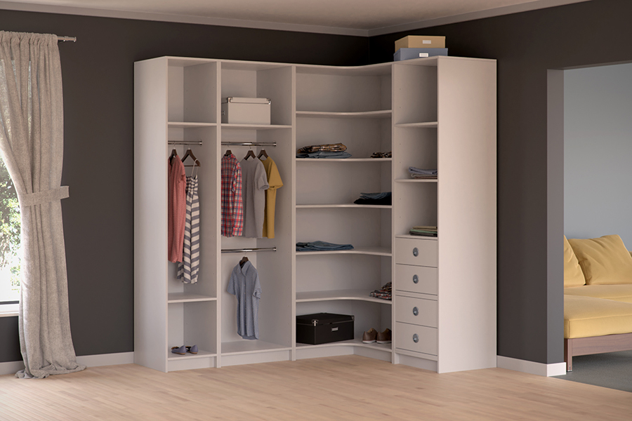Этот модульный угловой шкаф подходит для больших помещений. Рекомендуемая длина стен — 100–120 см. Отличается большой вместимостью. Его удобно использовать для хранения мелких предметов, потому что полки имеют необычную треугольную форму. Модель занимает много места, хорошо подходит для квадратных комнат. По одной стороне может располагаться штанга для верхней одежды с корзиной или выдвижным ящиком для обуви, по другой — идущий сверху вниз ряд полочек.